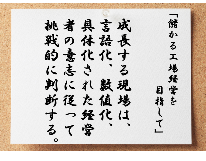 地図のない航海から、羅針盤を手にした航海に変わるのです。経営者が工場を不在にしていても、右腕役や現場キーパーソンは、経営者の意志に沿った、挑戦的な判断ができます。